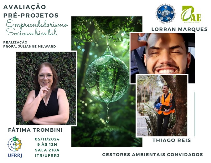 Convidamos toda a comunidade acadêmica para a Primeira Rodada de Exposição dos Projetos de Empreendedorismo Socioambiental dos alunos do curso de graduação em Gestão Ambiental do Instituto Três Rios/ UFRRJ, 3ª edição, inscritos na disciplina optativa de mesmo nome.