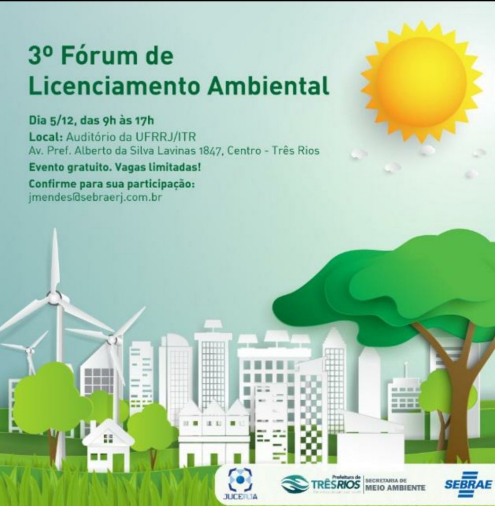 A Prefeitura de Três Rios, através da Secretaria Municipal de Meio Ambiente e Agricultura, em parceria com o Sebrae, realiza no próximo dia 05 de dezembro o 3º Fórum de Licenciamento Ambiental. O evento será aberto ao público e acontece no auditório da UFRRJ/ITR, de 9h às 16h.