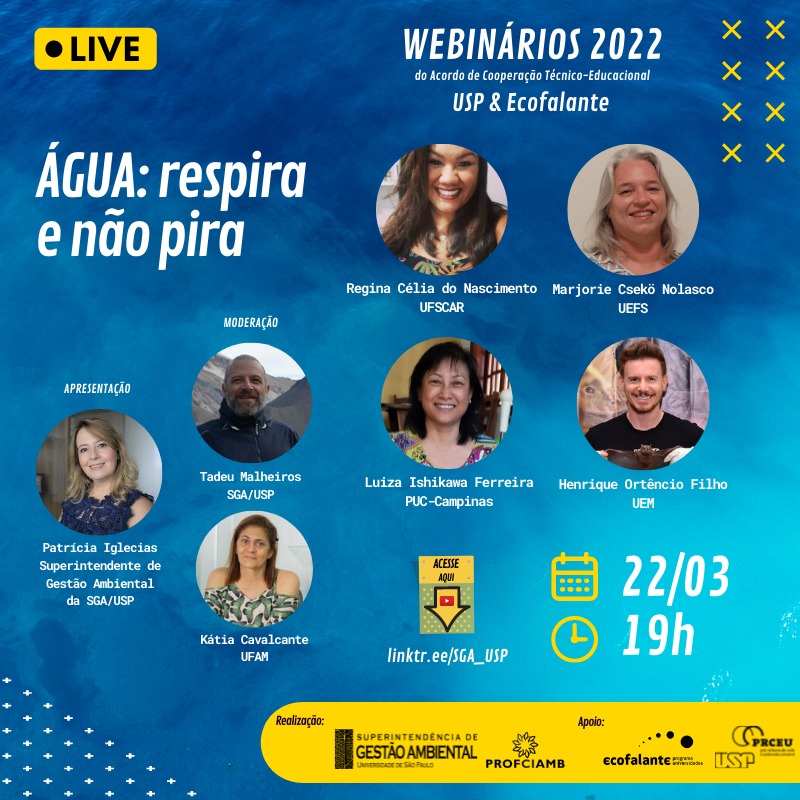 A USP, via sua Superintendência de Gestão Ambiental, em parceria com o Programa de Pós Graduação em Rede Nacional para Ensino das Ciências Ambientais (PROFCIAMB) e com o apoio do Programa Ecofalante Universidades e da Pró-Reitoria de Cultura e Extensão Universitária da USP (PRCEU/USP), realizam o webinário “ÁGUA: respira e não pira!”.