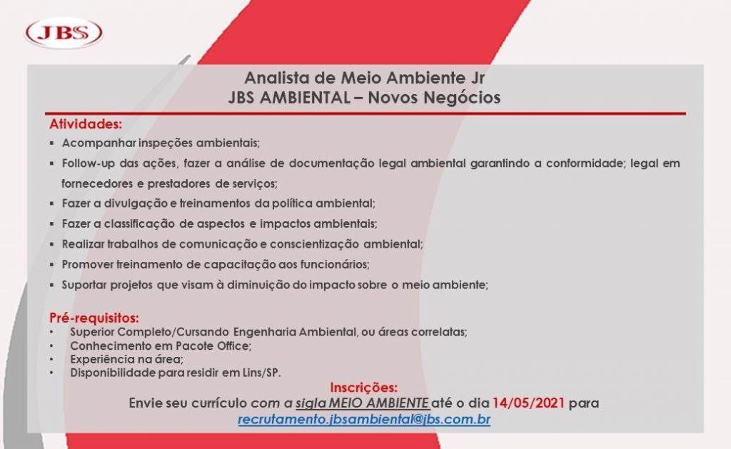 Analista de Meio Ambiente Jr, JBS Ambiental – Novos Negócios