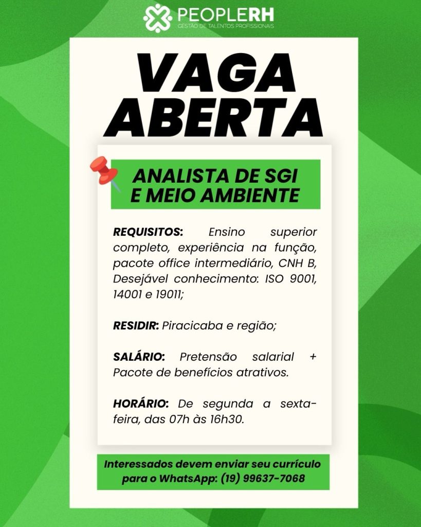 Analista de SGI e Meio Ambiente, Piracicaba e Região