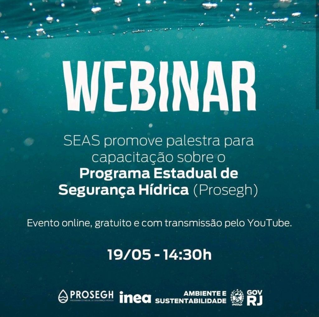 A Secretaria de Estado do Ambiente e Sustentabilidade (Seas) promove, na próxima quarta-feira (19/5), às 14h30, capacitação online sobre o Programa Estadual de Segurança Hídrica (Prosegh). O curso é gratuito e será transmitido pelo YouTube do Instituto Estadual do Ambiente (Inea). Criado pelo decreto 47.498 de fevereiro de 2021, o Prosegh tem como missão garantir água em quantidade e qualidade para as necessidades humanas, ambientais e econômicas em todo o território fluminense. O programa foi estruturado em quatro componentes (Planejamento, Oferta Hídrica, Qualidade Ambiental e Riscos associados às águas), que serão explicados e detalhados durante a capacitação. O programa prevê ainda um portfólio de investimentos contendo as ações, projetos e programas a serem implantados no Estado do Rio de Janeiro com objetivo de aumentar a segurança hídrica da região. Para mais informações sobre o programa acesse o site disponível aqui ou entre em contato pelo e-mail: prosegh.rj@gmail.com Fonte: Inea