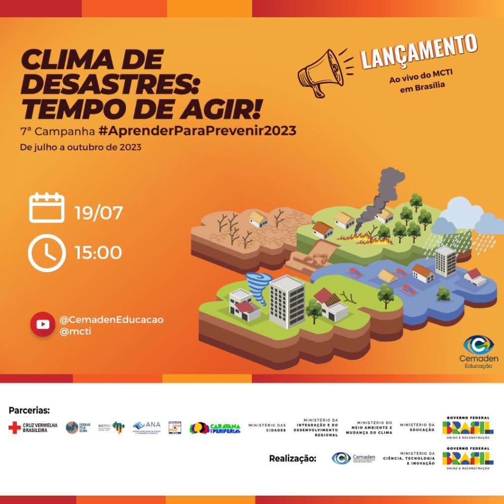 Evento híbrido: transmissão ao vivo pelos canais do YouTube do Cemaden Educação (https://www.youtube.com/watch?v=cZdWYRtvLug) e do MCTI (https://www.youtube.com/watch?v=BqGzV9X9uL8).