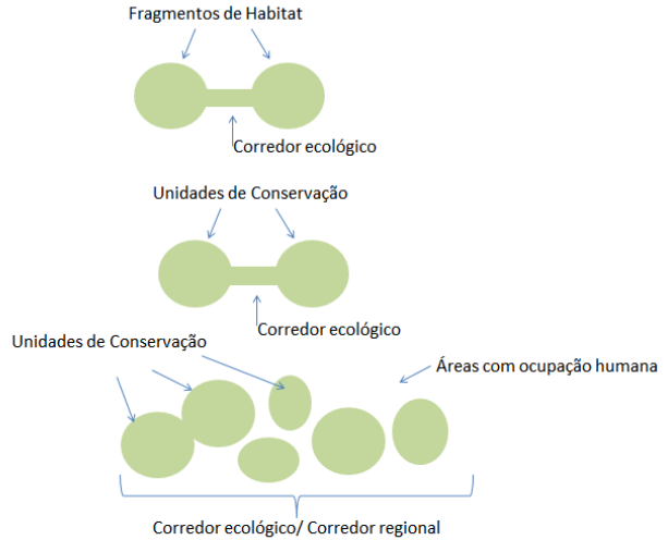 Os termos “corredores ecológicos” e “corredores de biodiversidade” muitas vezes se referem a faixas de vegetação que conectam fragmentos florestais (Figura 1). No SNUC, o termo corredor ecológico é restrito a porções de ecossistemas naturais ou seminaturais que ligam Unidades de Conservação da Natureza. Outras vezes, esses termos se referem a um conjunto de Unidades de Conservação da Natureza de uma região que estão próximas ou conectadas e, nesse caso, pode-se utilizar o termo corredores regionais de biodiversidade.