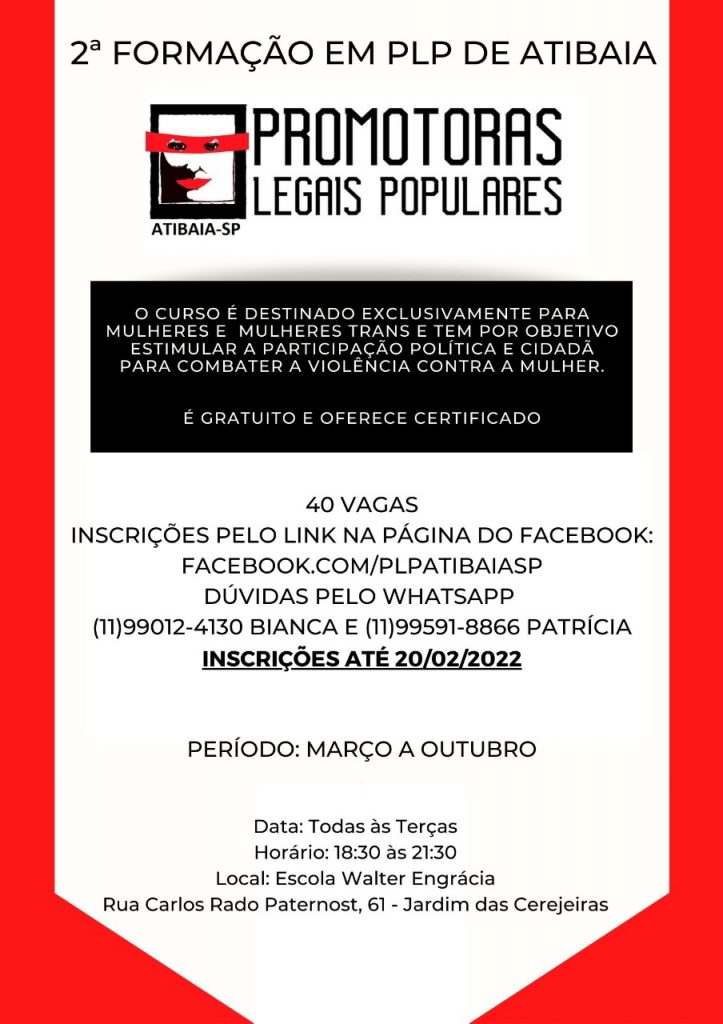 CURSO GRATUITO DE FORMAÇÃO PROMOTORAS LEGAIS POPULARES (2022) – ATIBAIA/SP