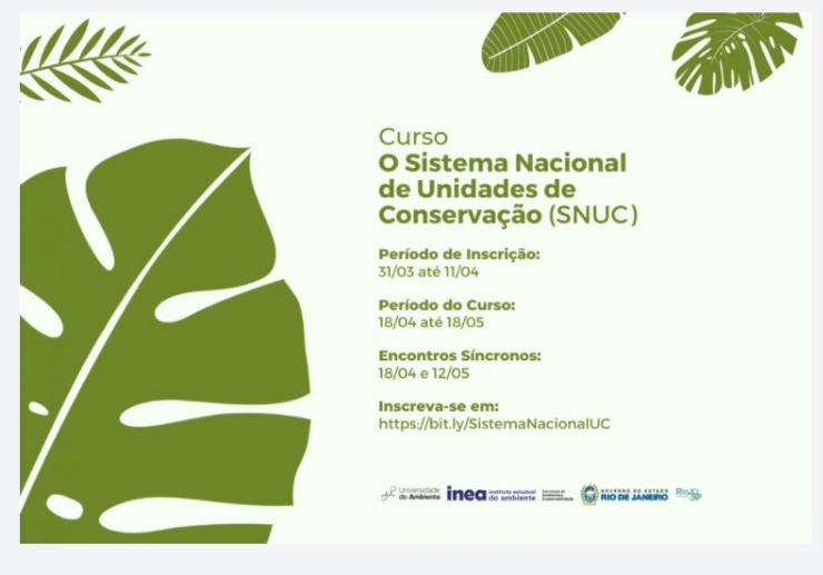 A Secretaria de Estado do Ambiente e Sustentabilidade (Seas) e o Instituto Estadual do Ambiente (Inea) vão promover entre os dias 18/4 e 18/5 o curso de capacitação “Sistema Nacional de Unidades de Conservação (SNUC): Marco Legal Orientador para a Gestão Ambiental Municipal”. O objetivo é instruir os gestores municipais de meio ambiente sobre a aplicação municipal da legislação que orienta a criação, implementação e gestão das unidades de conservação.
