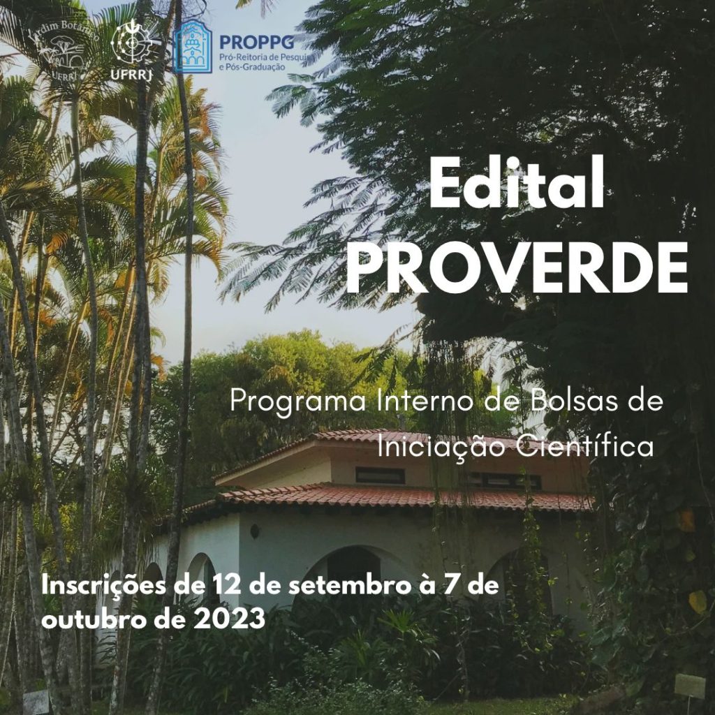Para mais informações acesse o site institucional: https://institucional.ufrrj.br/jardimbotanico/abertas-as-inscricoes-para-o-edital-proverde-2023-2024-do-jardim-botanico-da-ufrrj/