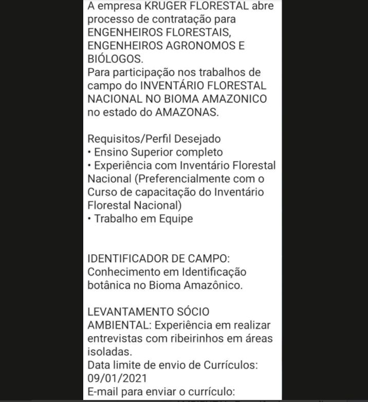 Engenheiros(as) Florestais, Engenheiros(as) Agrônomos(as) e Biólogos(as), KRUGER FLORESTAL