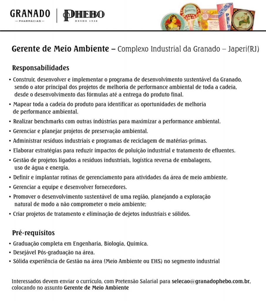 Gerente de Meio Ambiente, Complexo Industrial da Granado – Japeri/RJ