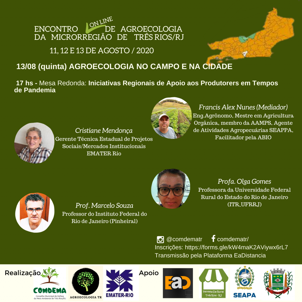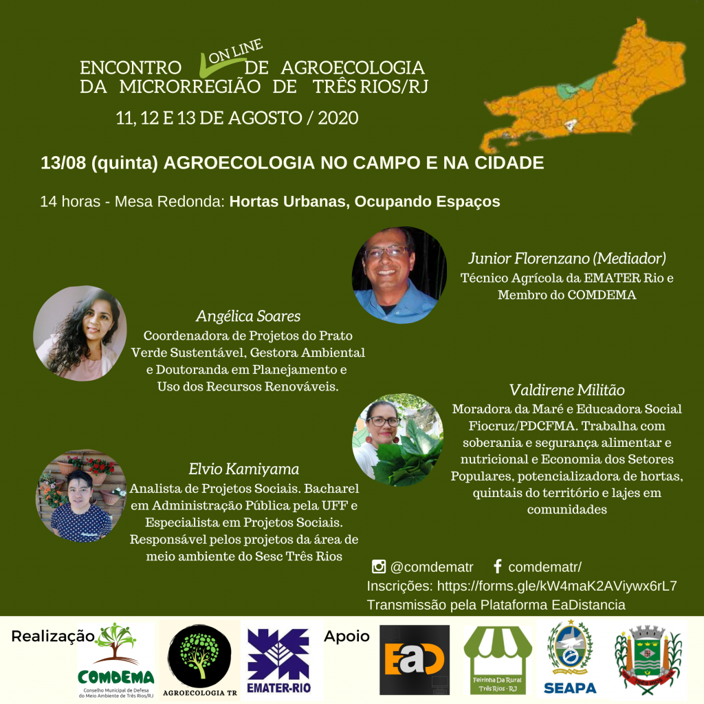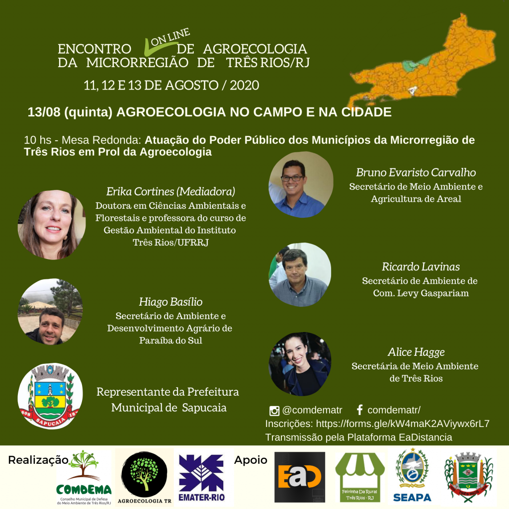 10 h – Mesa redonda: ATUAÇÃO DO PODER PÚBLICO DOS MUNICÍPIOS DA MICRORREGIÃO DE TRÊS RIOS EM PROL DA AGROECOLOGIA