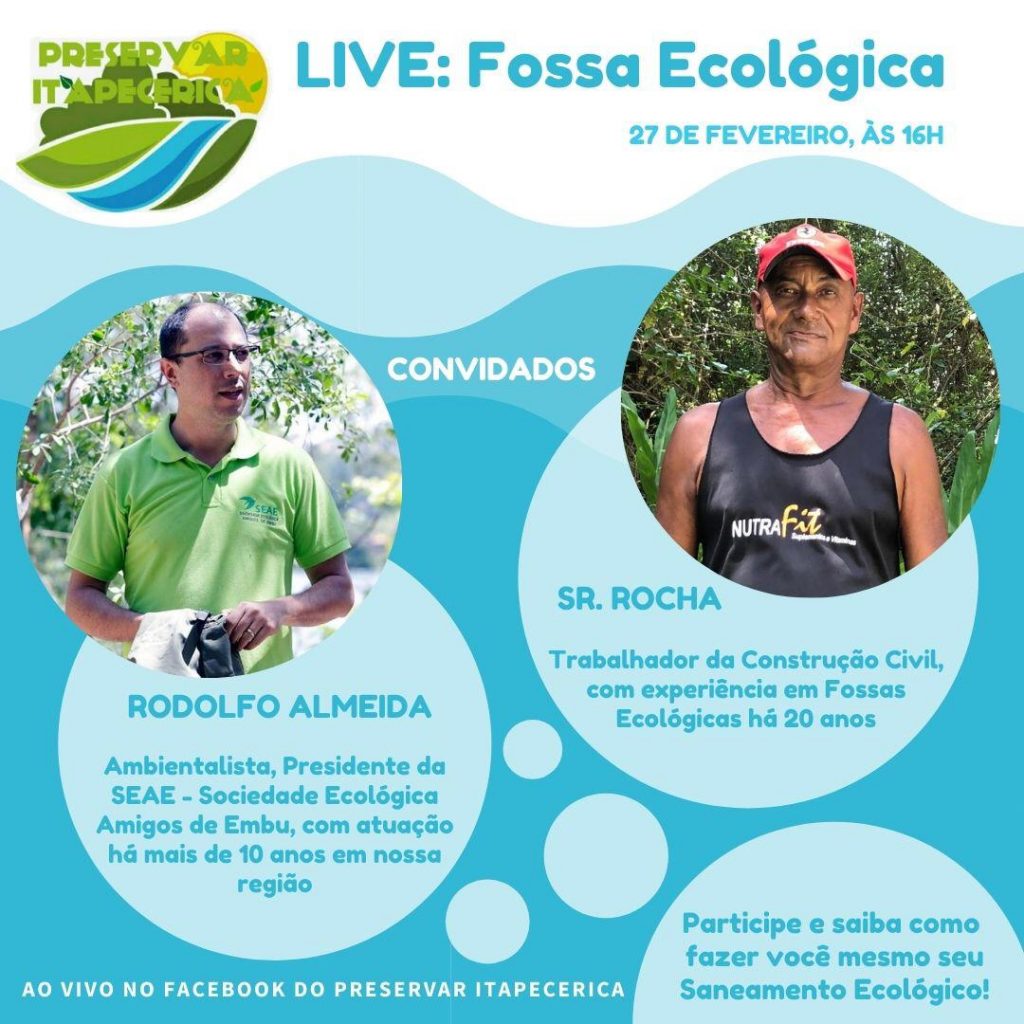 Divulgando a próxima LIVE do Movimento Preservar, sobre Fossas Ecológicas e Saneamento. Vamos receber dois experts no assunto, Rodolfo Almeida da Sociedade Ecológica Amigos de Embu (SEAE) e o Sr. Rocha, pedreiro especializado na construção do Canteiro Biosséptico e do Jardim Filtrante. Vai ser um bate-papo cheio de experiências concretas em nossa região e muito aprendizado. Vamos divulgar as Cartilhas para você mesmo construir seu sistema de Saneamento Ecológico e tirar suas dúvidas.