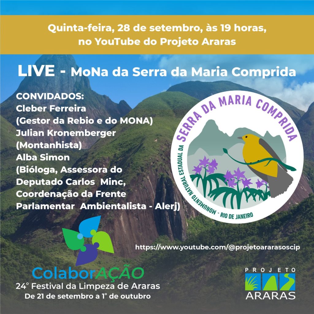 Nesta 5ª feira, 28/09, às 19 horas, no YouTube do Projeto Araras, vamos receber Cleber Ferreira (Gestor da Rebio e do MONA), Julian Kronemberger (Montanhista) e Alba Simon (Bióloga, Assessora do Deputado Carlos Minc, coordenação da Frente Parlamentar Ambientalista – Alerj), para uma conversa sobre o MoNa da Serra da Maria Comprida.
