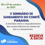O tema que será abordado na quinta edição do Seminário de Saneamento do Comitê Piabanha será: A interface entre o enquadramento dos corpos hídricos em classes de uso e o saneamento. Dias 20 e 27 de outubro de 2021! *A programação e os horários serão divulgados posteriormente.