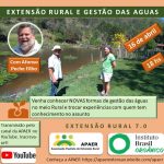 16 de abril 2021 – 6a. Feira – 18 Horas Por favor, reservem essa data e horário.Oficina de trocas de experiências:EXTENSÃO RURAL E GESTÃO DAS ÁGUAS.Com Afonso Peche e apresentação de Experiências Práticas.No canal do YouTube da APAER – Associação Paulista de Extensão Rural.EXTENSÃO RURAL 7.0. MaisExtensãoRuralé+Saúde