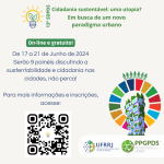 Estão abertas as inscrições para o 13° Seminário do PPGPDS! Este ano o tema é “Cidadania sustentável: uma utopia? Em busca de um novo paradigma urbano”, que contará com 9 painéis com debates sobre sustentabilidade e cidadania. O 13° SDPDS acontecerá de 17 a 21 de junho, on-line e gratuito! Acesse o site e confira […]