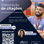 Capacitação do 4º Ciclo de Treinamentos Virtuais: Elaboração de Citações – ABNT NBR 10520:2023 que ocorrerá quarta-feira (24/04/2024) às 14h. Aprenda a elaborar as citações de acordo com a norma! Data: 24 de abril de 2024 Horário: 14h00 Link de inscrição: https://forms.gle/bL7WeEB4Z9AKmVoR9 Instrutor: Igor Falce Mediadora: Márcia Aguiar Transmissão através do canal do Youtube da Biblioteca de Manguinhos: https://www.youtube.com/watch?v=fXa-cWy0mk0 HAVERÁ EMISSÃO […]