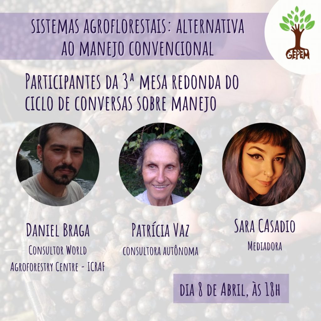Nesta edição, iremos abordar o tema “Sistemas Agroflorestais: Alternativa ao Manejo Convencional” e contaremos com a participação de: Patrícia Vaz, consultora autônoma, e Daniel Braga, consultor do World Agroforestry Centre – ICRAF.