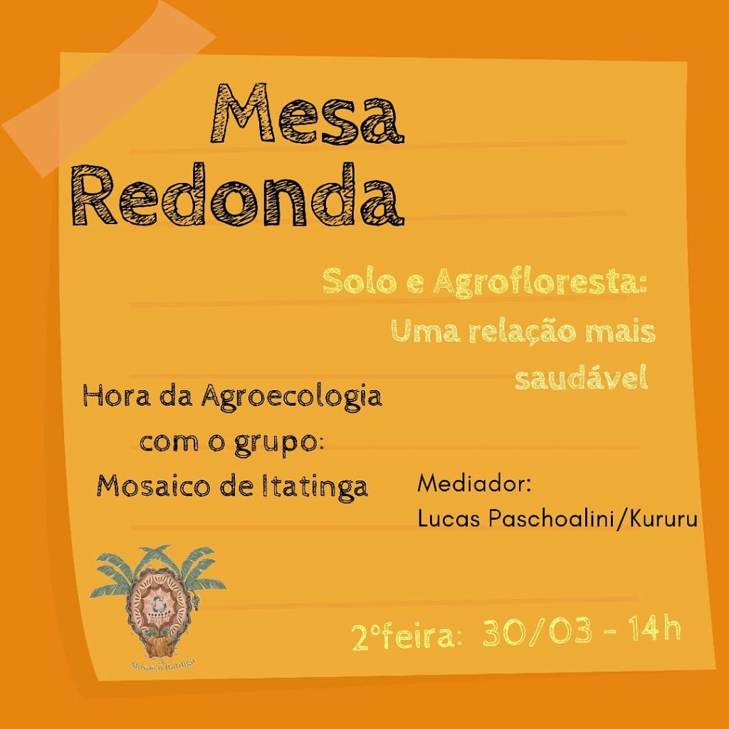 O Grupo Mosaico de Itatinga, convida vocês à fazer parte da nossa Mesa Redonda da Hora da Agroecologia com o tema: