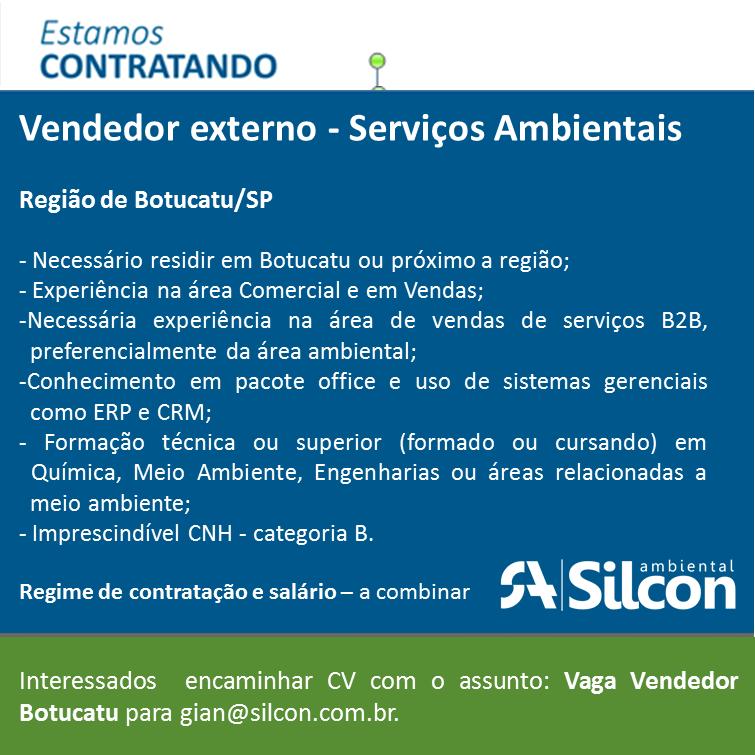 Interessados encaminhar CV com o assunto: Vaga Vendedor Botucatu para gian@silcon.com.br.