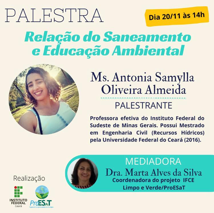 Palestrante: Antonia Samylla Oliveira Almeida, professora efetiva do Instituto Federal do Sudeste de Minas Gerais. Possui graduação em Tecnologia em Gestão Ambiental pelo IFCE (2013), mestrado em Engenharia Civil (Recursos hídricos) pela UFC (2016) e é doutoranda em Engenharia Civil (Recursos Hídricos) pela UFC (2017).