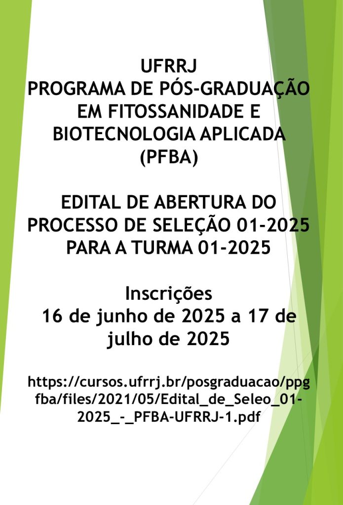 Para mais informações, acesse: https://cursos.ufrrj.br/posgraduacao/ppgfba/files/2021/05/Edital_de_Seleo_01-2025_-_PFBA-UFRRJ-1.pdf