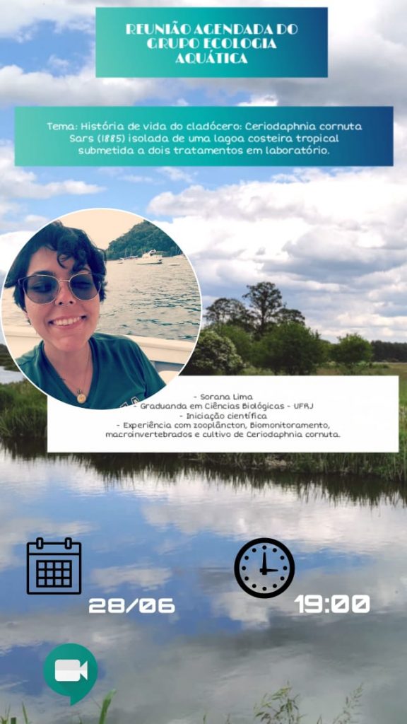 No dia 28/06 ás 19:00h estaremos realizando mais uma reunião do nosso grupo de estudos: Ecologia Aquática. Desta vez contaremos com a presença da Discente Sorana Lima da UFRJ que trabalha com cultivo de Ceriodaphnia cornuta e é orientanda do Prof Reinaldo Luiz Bozelli. A Sorana irá falar sobre o seu trabalho de Iniciação científica com a espécie Ceriodaphnia cornuta, como é feito o cultivo, resultados e etc.