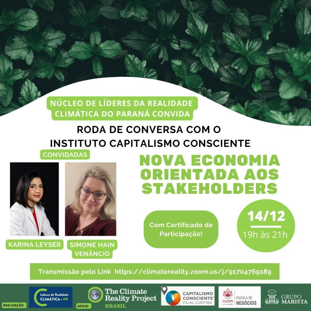 No dia próximo dia14/12/2022 das 19h às 21h acontecerá o evento online Roda de Conversa com o Instituto Capitalismo Consciente com as Convidadas Karina Leyser e Simone Hain Venâncio, com acesso pelo link do Zoom: https://climatereality.zoom.us/j/91704769189