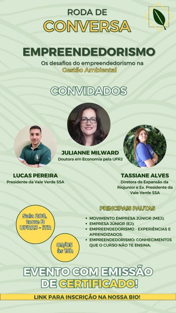 Na próxima terça, dia 09/05, a Vale Verde SSA juntamente com a Profa. Julianne Milward, Doutora em Economia, traz a discussão sobre os desafios do empreendedorismo para nós, futuros profissionais ou já profissionais da área Ambiental.