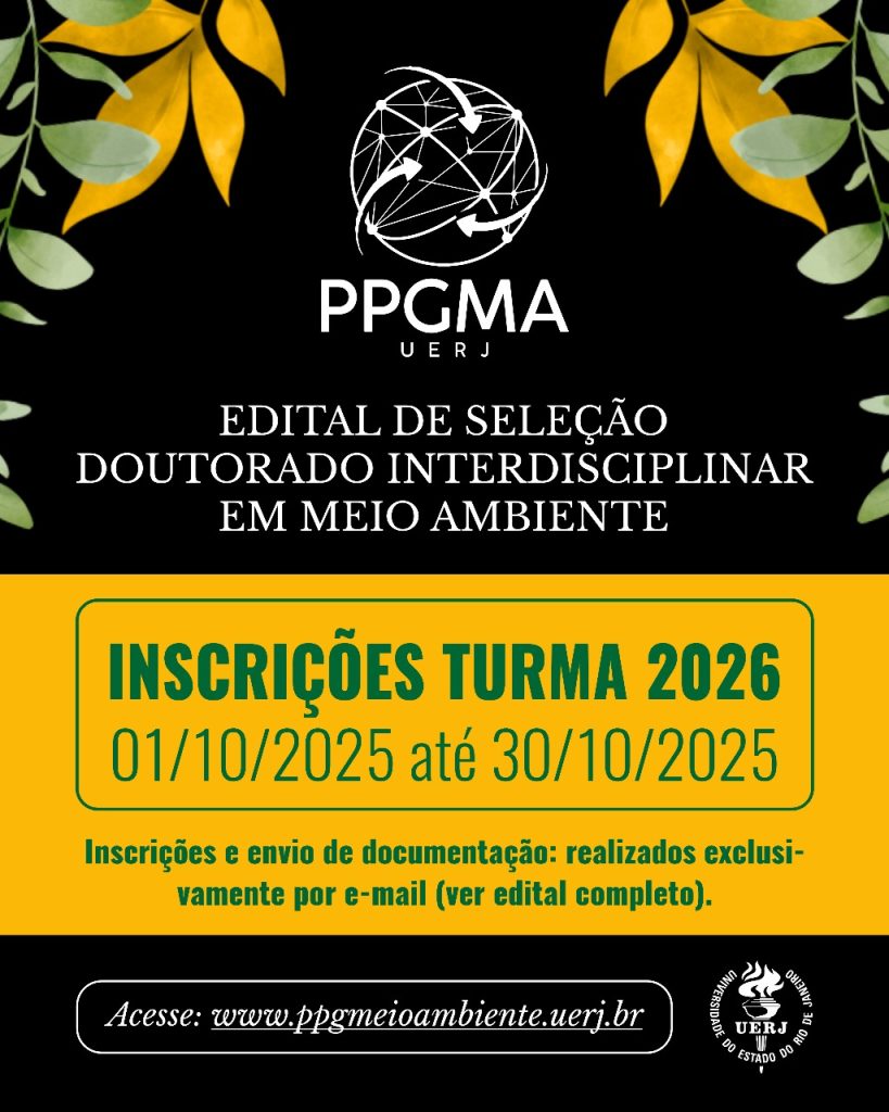 O Programa de Pós-Graduação em Meio Ambiente (PPG-MA/UERJ) está com inscrições abertas para o seu curso de Doutorado Acadêmico, com início no 1º semestre de 2026!