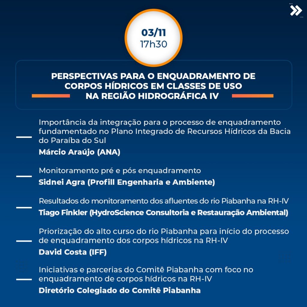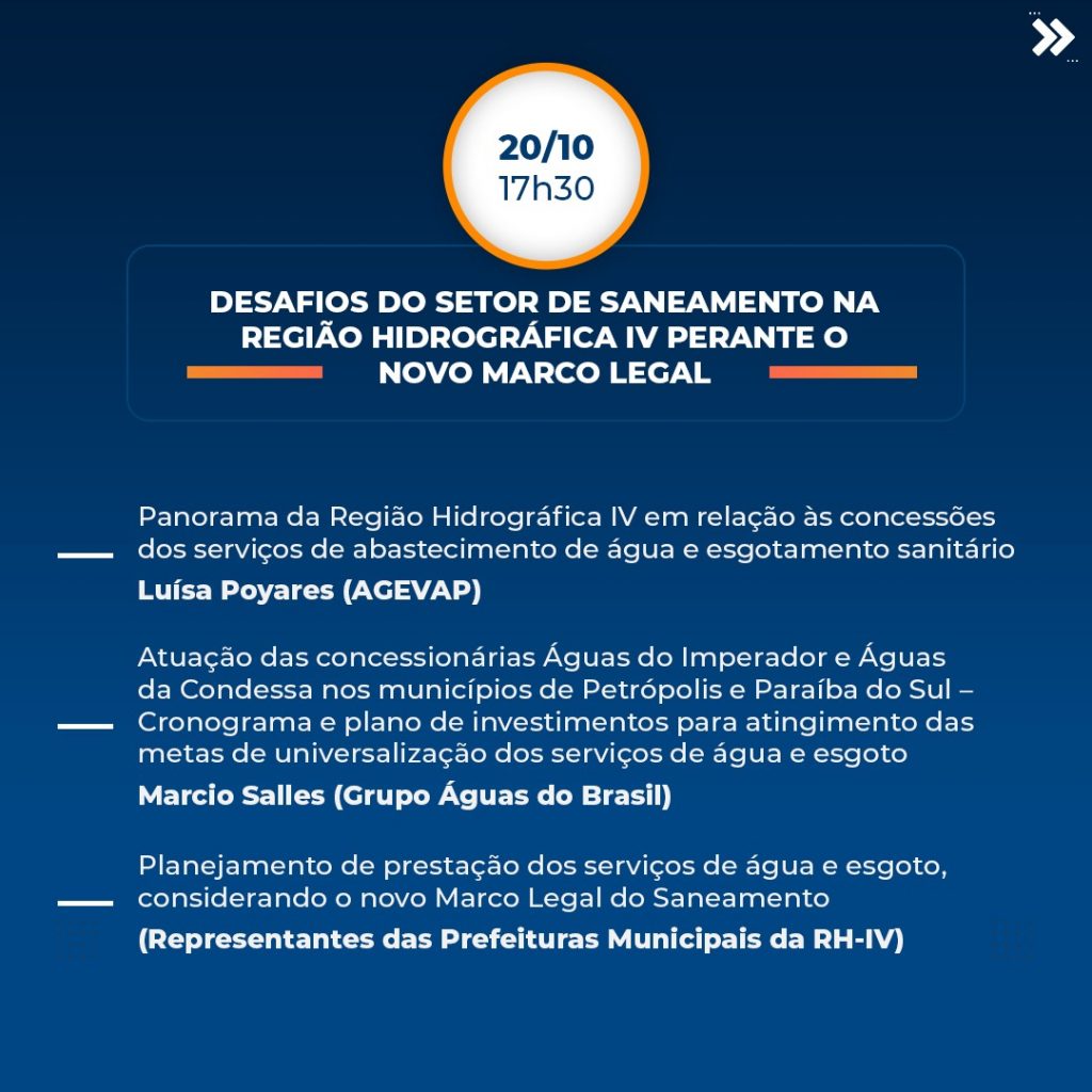 • Desafios do setor de saneamento na Região Hidrográfica IV perante o novo Marco Legal (dia 20/10).