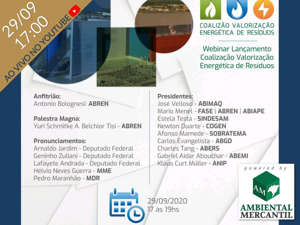 29/09 – 17h00 WEBINAR DE LANÇAMENTO DA COALIZÃO PELA VALORIZAÇÃO ENERGÉTICA DE RESÍDUOS – A ABREN convida você a participar deste webinar, que apresentará um Manifesto assinado por 10 importantes associações setoriais em prol da valorização energética de resíduos. Informações e inscrição aqui: https://ambientalmercantil.com/eventos-webinar-tecnologias-sustentabilidade-residuosolido-tratamentodeagua-saneamento-energias-solar-fv-wastetoenegy-economiacircular/coalizao-pela-valorizacao-energetica-de-residuos-webinar-de-lancamento.html