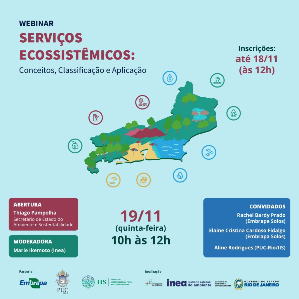 O Instituto Estadual do Ambiente (Inea), por meio da Universidade do Ambiente, realizará na próxima quinta-feira (19/11), o “Webinar Serviços Ecossistêmicos: conceitos, classificação e aplicação”, tendo a Empresa Brasileira de Pesquisa Agropecuária (EMBRAPA) Solos, a Pontifícia Universidade Católica do Rio de Janeiro (PUC-Rio) e o Instituto Internacional para Sustentabilidade (IIS) como convidados.