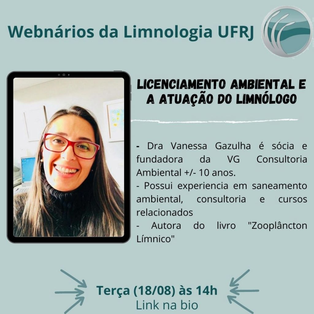 Gostaríamos de convidá-l@s para o webinário da Dra Vanessa Gazulha, a ser realizado nesta terça-feira (18/08/20) às 14h. A Vanessa apresentará a palestra intitulada: “Licenciamento ambiental e atuação do limnólogo”.