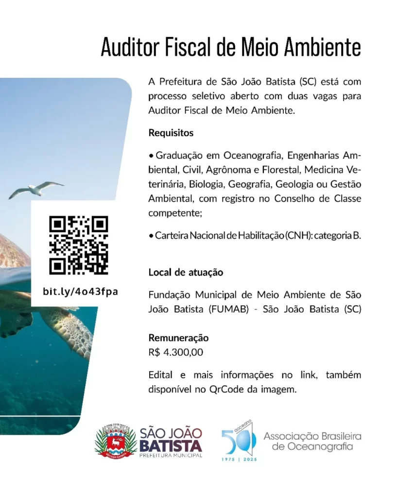 A Prefeitura de São João Batista (SC) está com processo seletivo aberto com duas vagas para Auditor Fiscal de Meio Ambiente.