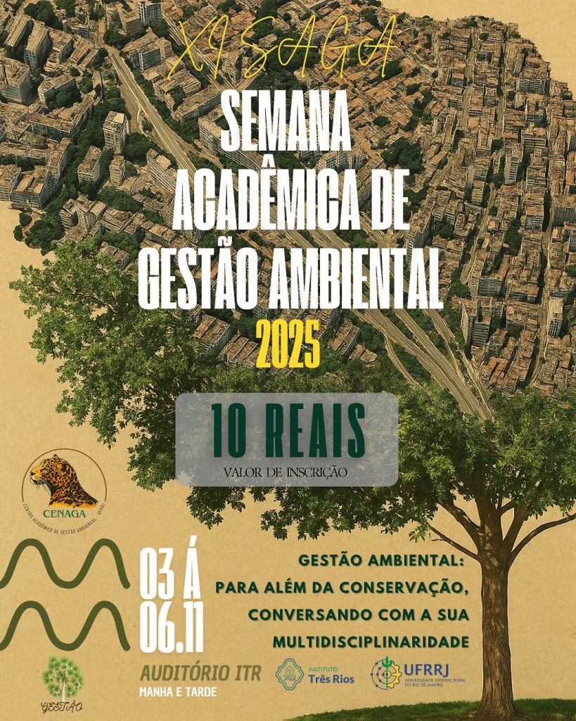De 03 a 06 de novembro, o Centro Acadêmico de Gestão Ambiental (CENAGA) e o Instituto Três Rios (ITR) te convidam a ir além da conservação e mergulhar nas múltiplas dimensões da Gestão Ambiental — ciência, sociedade, políticas públicas, inovação e muito mais. 🌱