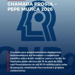 O Conselho Nacional de Desenvolvimento Científico e Tecnológico (CNPq), em parceria com o MCTI, está com inscrições abertas para a chamada PROSUL – Pepe Mujica 2026. São R$50 milhões para fortalecer redes de pesquisa entre Brasil, América Latina e Caribe.🎓 Apoio com bolsas, custeio e mobilidade internacional.🤝 Projetos colaborativos e redes temáticas.📅 Prazo final: 30 […]