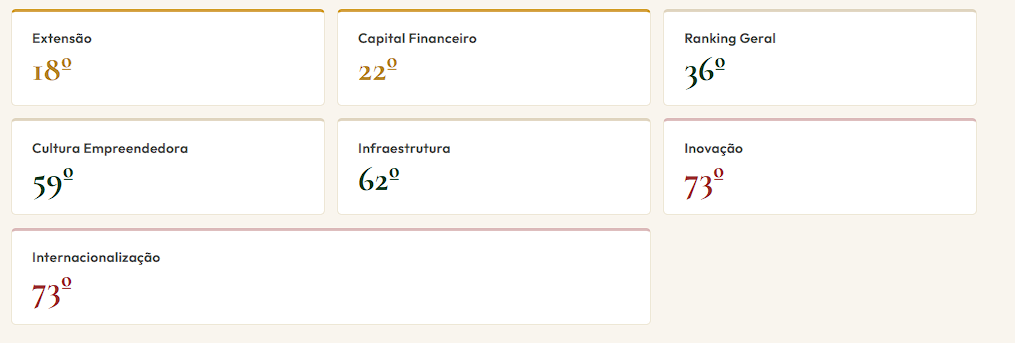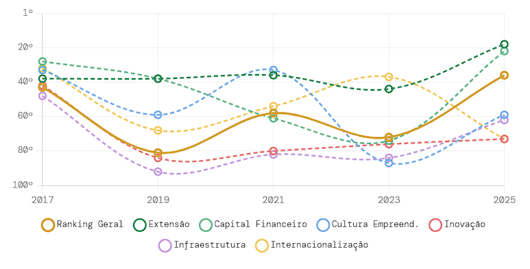 A Extensão se destaca como o principal vetor de melhoria: evoluiu de posições medianas para o expressivo 18º lugar em 2025. O Capital Financeiro também registrou salto expressivo, chegando ao 22º lugar após oscilar entre 28º e 74º. A Inovação permanece em patamares baixos em todo o período, sem avanços significativos, e a Infraestrutura apresentou seu pior momento em 2019 (92º), com melhora gradual até 62º em 2025.