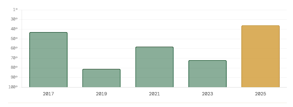 A análise histórica revela um percurso marcado por três momentos distintos: um desempenho positivo em 2017 (43º), uma queda acentuada em 2019 (81º) — o pior momento da série —, e uma recuperação que, embora instável em 2023 (72º), culminou em um salto significativo em 2025.
