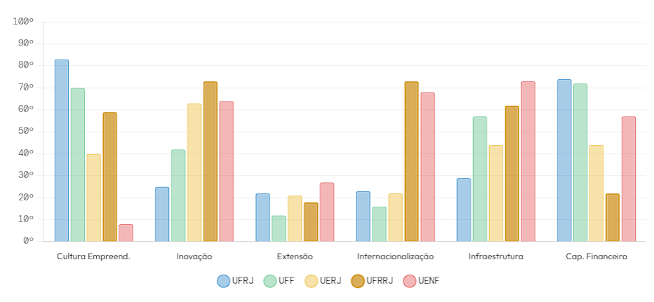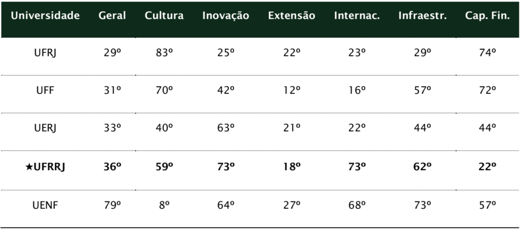 A UFRJ lidera o ranking geral (29º) com desempenho equilibrado em Inovação (25º), Extensão (22º) e Infraestrutura (29º), embora apresente fragilidade em Cultura Empreendedora (83º). A UFF (31º) se destaca em Extensão (12º) e Internacionalização (16º). A UERJ (33º) apresenta o perfil mais equilibrado, com bom resultado em Cultura Empreendedora (40º). A UENF, apesar do 79º lugar geral, registra o resultado isolado mais impressionante do grupo: 8º lugar em Inovação no ranking nacional. Já a UFRRJ (36º) constrói sua vantagem em Extensão e Capital Financeiro — os dois critérios em que supera todas as demais universidades fluminenses.