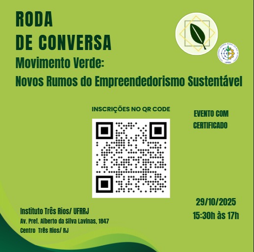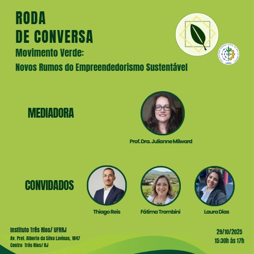 No dia 29 de outubro de 2025, o Instituto Três Rios da Universidade Federal Rural do Rio de Janeiro (UFRRJ) sediará a Roda de Conversa “Movimento Verde: Novos Rumos do Empreendedorismo Sustentável”.