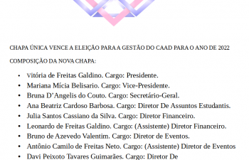 CHAPA ÚNICA VENCE A ELEIÇÃO PARA A GESTÃO DO CAAD PARA O ANO DE 2022 COMPOSIÇÃO DA NOVA CHAPA: • Vitória de Freitas Galdino. Cargo: Presidente. • […]
