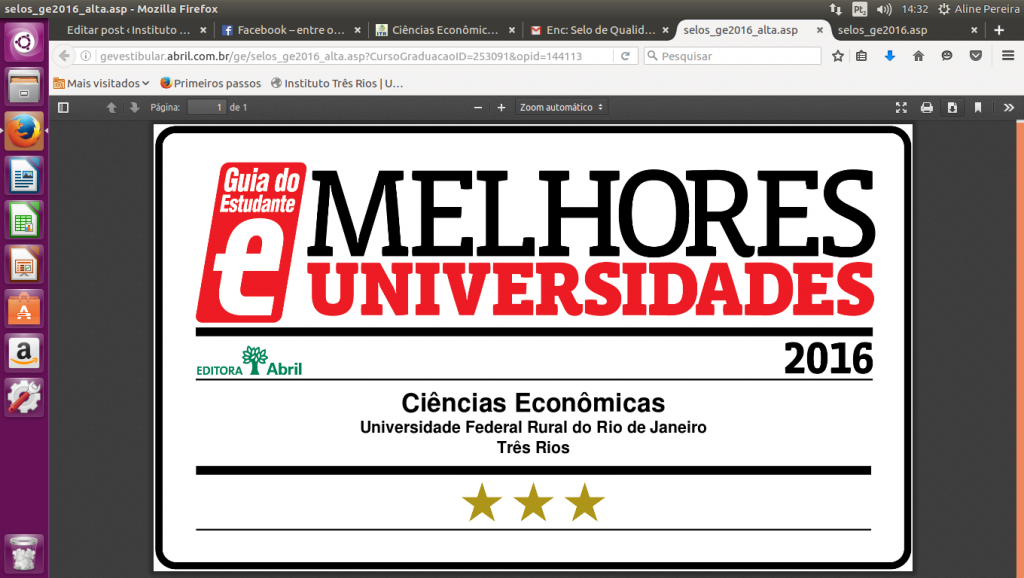 O Curso de Ciências Econômicas do Instituto Três Rios da Universidade Federal Rural do Rio de Janeiro (ITR/UFRRJ) foi estrelado na avaliação de cursos superiores realizada pelo Guia do Estudante (GE) no ano de 2016 e constará da publicação GE Profissões Vestibular 2017, que passa a circular nas bancas a partir do dia 14 de outubro.