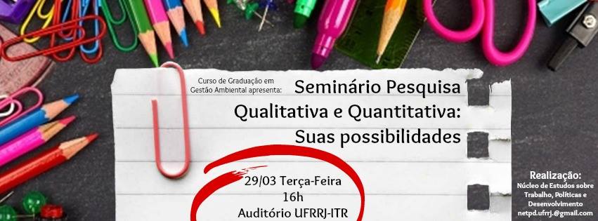 O Núcleo de Estudos sobre Trabalho, Políticas e Desenvolvimento (NETPD) e os estudantes do Curso de Gestão Ambiental do Instituto Três Rios da Universidade Federal Rural do Rio de Janeiro (ITR/UFRRJ) convidam para o ‘Seminário Pesquisa Qualitativa e Quantitativa: Suas possibilidades’. O evento, que será realizado em 29 de março de 2016, das 16h às 18h, no auditório do ITR/UFFRJ, é gratuito e aberto à comunidade acadêmica. Não é necessário fazer inscrição, mas haverá lista de presença e emissão de certificado.