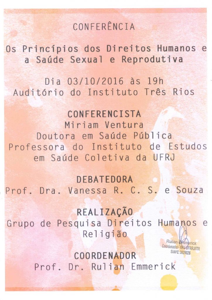 O Grupo de Pesquisa Direitos Humanos e Religião, sob coordenação do professor Rulian Emmerick, convida para a conferência “Os Princípios dos Direitos Humanos e a Saúde Sexual e Reprodutiva”, na próxima segunda-feira, 03 de outubro, às 19h, no auditório do Instituto Três Rios (ITR/UFRRJ).