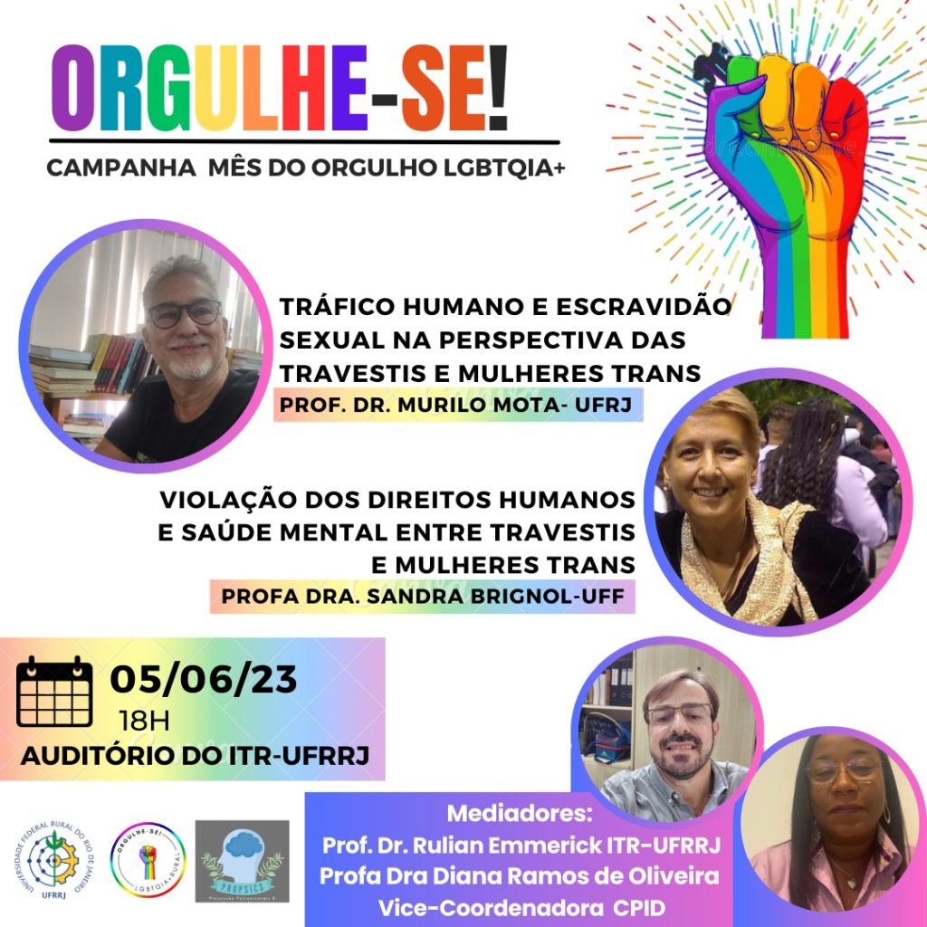 Como parte das atividades da campanha institucional ‘Orgulhe-se! LGBTQIA+ Rural’, o câmpus Três Rios da UFRRJ promove o evento “Avanços e Desafios nas garantias dos Direitos das pessoas Trans”. Os palestrantes convidados são os professores Murilo Mota (UFRJ) e Sandra Brignol (UFF), que apresentarão suas pesquisas sobre a temática. Com mediação dos professores Rulian Emmerick (Instituto Três Rios) e Diana Oliveira (vice-coordenadora da Comissão Permanente da Política Institucional pela Diversidade, Gênero, Etnia/Raça e Inclusão), a atividade acontece em 5 de junho, às 18h, no Auditório do ITR.