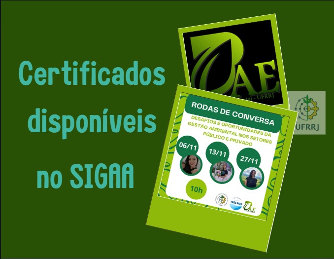 Os certificados das Rodas de Conversa “Desafios e Oportunidades da Gestão Ambiental nos Setores Público e Privado” já estão disponíveis no Sistema Integrado de Gestão de Atividades Acadêmicas (Sigaa/UFRRJ). Promovidas […]