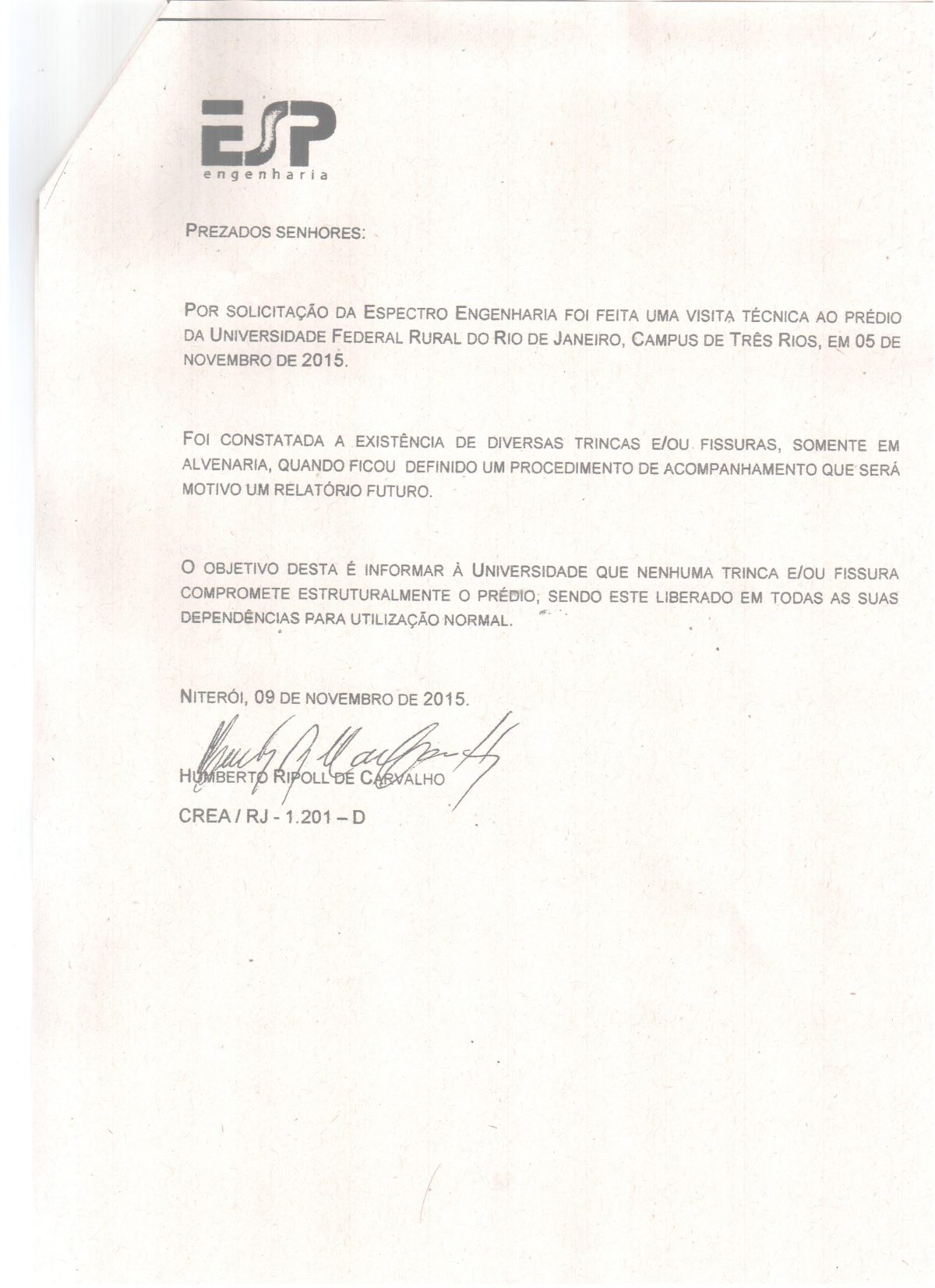 A empresa ESP Engenharia divulgou esta semana correspondência com o resultado da visita técnica feita ao Instituto Três Rios (ITR/UFRRJ), para verificar as trincas/fissuras presentes em alguns pontos da sede […]
