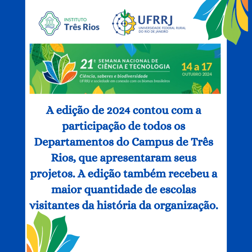 A edição da Semana Nacional de Ciência e Tecnologia 2024 contou com a participação de todos os departamentos do Instituto Três Rios (ITR/UFRRJ), que apresentaram seus projetos. A edição recepcionou a maior quantidade de escolas da história da organização.