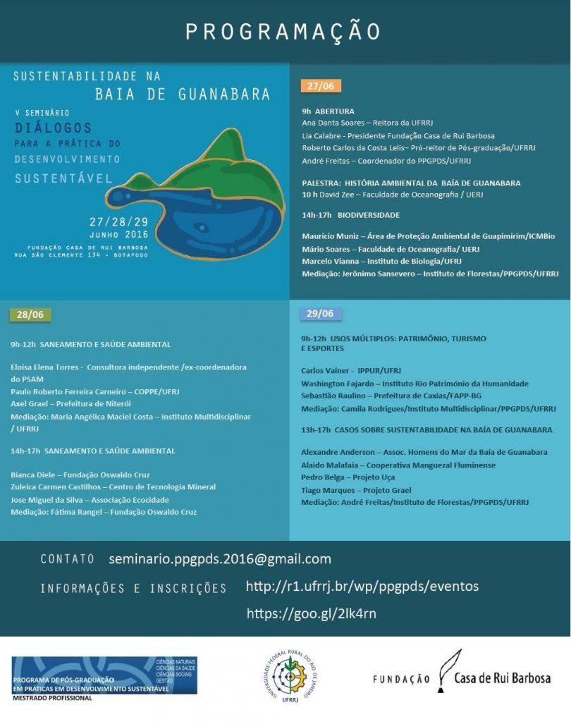O Mestrado Profissional em Práticas em Desenvolvimento Sustentável da UFRRJ realiza de 27 a 29 de junho de 2016, na Fundação Casa de Rui Barbosa, no Rio de Janeiro (RJ), o “V Seminário Diálogos para a Prática do Desenvolvimento Sustentável”. Nesta edição o tema será “Sustentabilidade na Baía de Guanabara”.As inscrições são gratuitas e serão emitidos certificados por painel.Confira o link e a página do evento no Facebook: